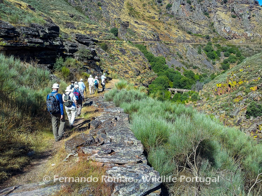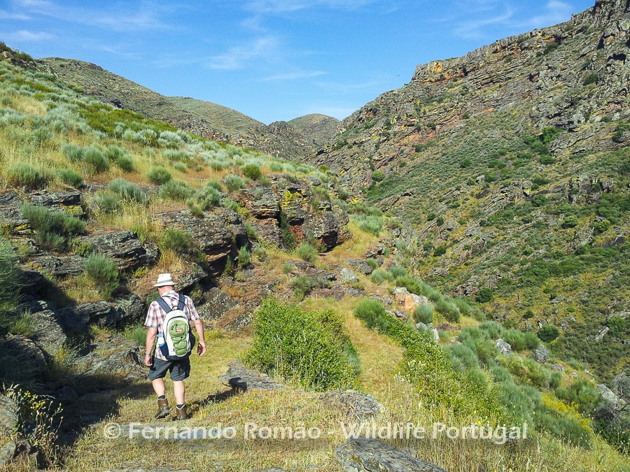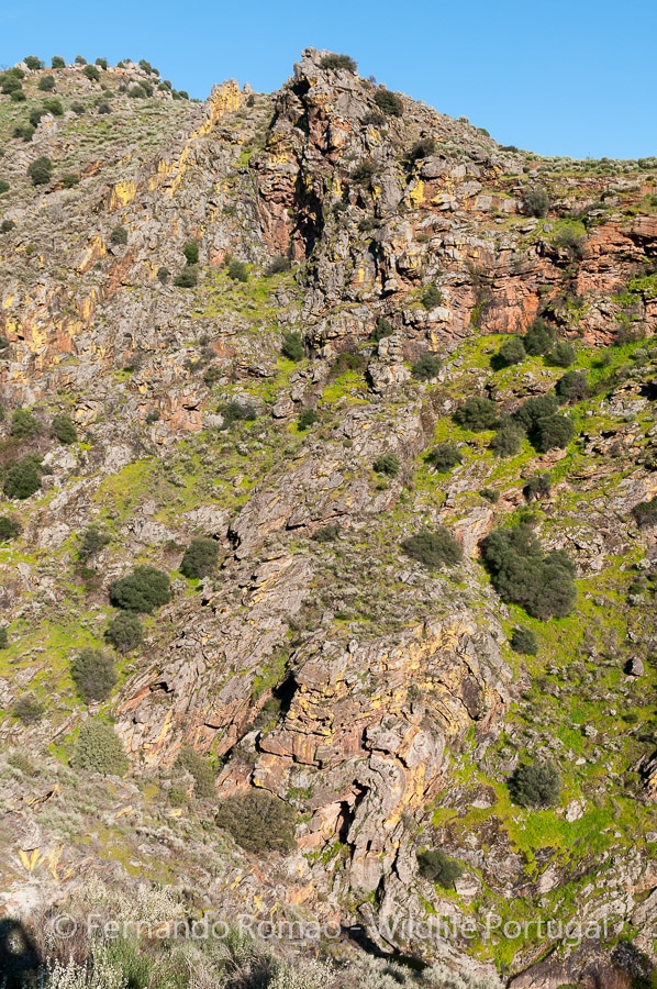 The geology aspects are enhanced by the quartzite outcrops that break through the schist slopes and rise above the ground, assuming strange and interesting shapes, such as folds and natural walls like the “Abalona“. These rocky formations allow the presence of an interesting diversity of cliff-breeding birds, such as the Golden Eagle, the Griffon Vulture, the Egyptian Vulture, the Black Stork, the Black Wheatear, the Blue Rock Thrush and the Crag Martin. On the bottom of the valley, by the water, we can find the Spanish Terrapin (Mauremys leprosa) and the Iberian Water Frog (Pelophylax perezi). Here is also one of the best places to find the Nettle-Tree Butterfly (Libythea celtis), a particular butterfly of mediterranean distribution.